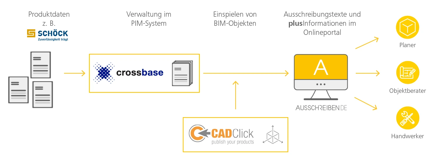 Schöck nutzt seit 2011 das Product Information Management (PIM) von crossbase, um Produkt- und Mediendaten zentral zu verwalten. Diese Daten fließen in verschiedene Medien wie technische Dokumentationen, Preislisten und die Website ein. Über eine SAP-Schnittstelle werden ERP-Daten automatisch nach crossbase übertragen und dort gepflegt.
